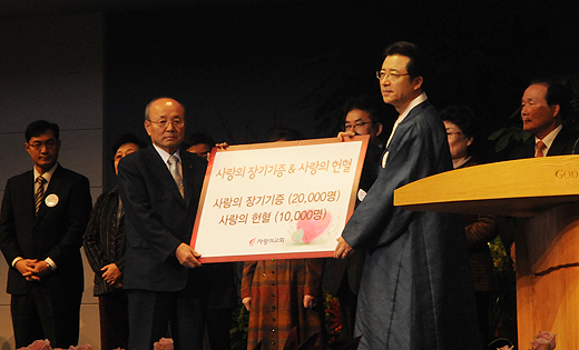| ▲3부 섬김의 순서 중 사랑의교회 오정현 담임목사가 사랑의교회 교인들이 사랑의 장기기증 및 사랑의 헌혈에 동참할 것을 약속하고 있다. ⓒ사진=김진한 기자 |