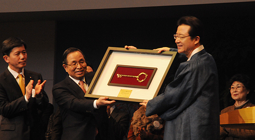 | ▲사랑의교회 새 예배당 건축위원장(좌)으로부터 ‘비전열쇠’를 전달받고 있는 사랑의교회 오정현 담임목사(우). ⓒ사진=김진한 기자 |