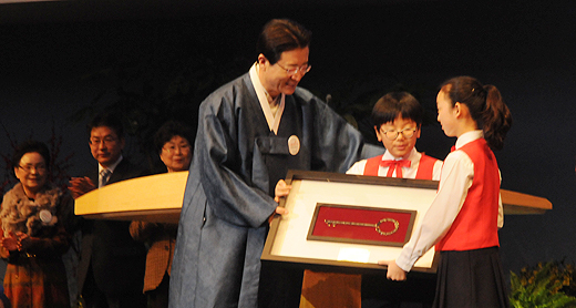 | ▲사랑의교회 오정현 담임목사(좌)가 다음 세대 어린이들에게 ‘비전열쇠’를 다시 전달하고 있다. ⓒ사진=김진한 기자 |