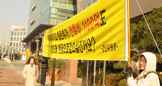 | ▲사랑의교회 일부 구성원들이 사랑의교회 새 예배당의 도로 맞은 편에서 건축비 추가 대출건과 관련해 항의 시위를 하고 있다. ⓒ사진=김진한 기자 |