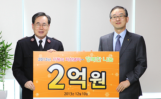 | ▲한국구세군 박종덕 사령관이 현대해상측으로부터 기부금 2억원을 전달 받고 있다. ⓒ한국구세군 제공 |