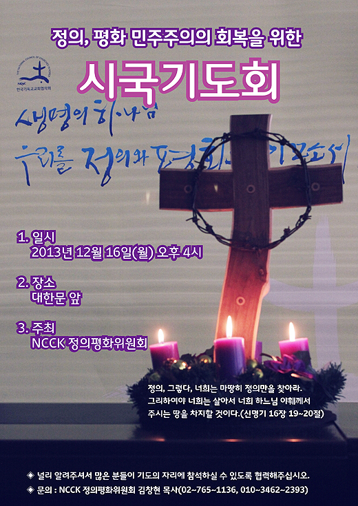 ‘정의, 평화 민주주의의 회복을 위한 시국기도회’가 오는 16일 오후 4시 대한문 앞에서 NCCK 정의평화위원회 주최로 열릴 예정이다. 주제 성구는 ‘정의, 그렇다, 너희는 마땅히 정의만을 찾아라. 그리하여야 너희는 살아서 너희 하느님 야훼께서 주시는 땅을 차지할 것이다.’(신명기 16장 19~20절)이다.