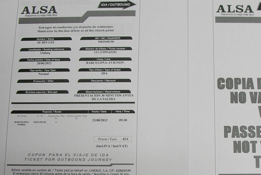 | ▲프랑스 툴루즈행 ALSA버스 예약 서류 |