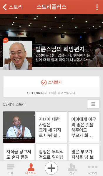 | ▲1월11일, 한 달 만에 구독자 100만명을 돌파한 ‘법륜스님의 희망편지’ 카카오스토리. |