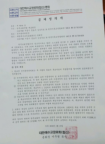 | ▲예장 합신 총회(총회장 이주형)가 한교연 선거관리위원장 앞으로 보낸 공개 질의서. |