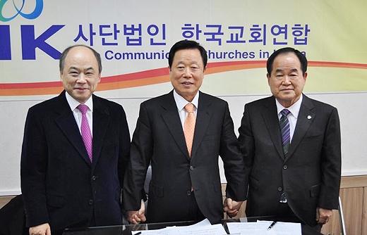 | ▲16일 한교연 선관위에서 공명선거 다짐하고 있는 한교연 대표회장 후보들. 왼쪽부터 권태진 후보, 김요셉 선관위 위원장, 한영훈 후보. ⓒ한교연 |