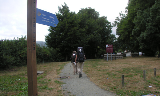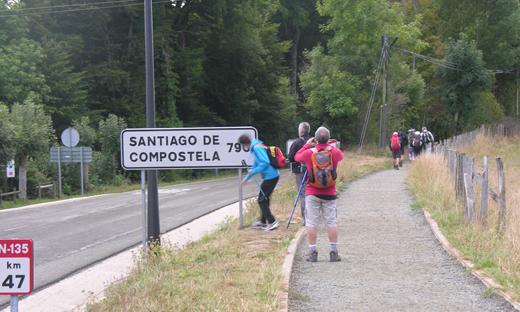| ▲부르게테로 들어가는 순례자들, 마을 간의 거리를 나타내는 이정표 |