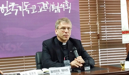 | ▲울라프 트베이트 WCC 총무가 9일 오후 서울 연지동 기독교회관 709호 NCCK 예배실에서 열린 WCC 방한단 기자회견에서 기자들의 질문에 답하고 있다. ⓒ사진=이인기 기자 |
