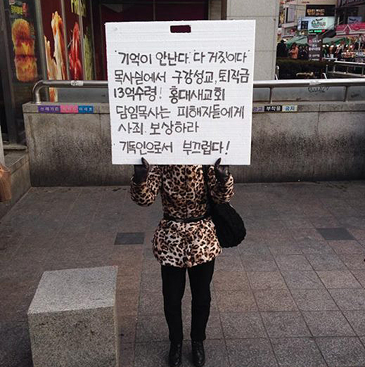 | ▲홍대새교회 앞에서 어느 여성이 여신도 성추행 사건으로 물의를 일으킨 뒤 있는 전병욱 목사에 성추행 피해자들에 대한 사죄와 보상을 촉구하며 피켓 시위를 하고 있다. ⓒ베리타스 DB |