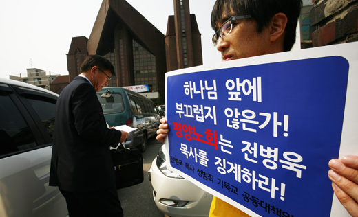 | ▲전병욱 목사의 홍대새교회 노회 가입 청원 논란에 관련 시민단체 회원들이 피켓 시위를 벌이고 있다. ⓒ사진=지유석 기자 |