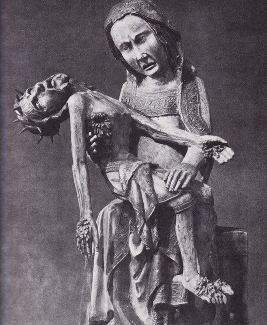 그러나 이 작가는 마리아의 외모보다는 한 아들의 어머니로서 가슴이 찢어질 듯한 고통을 강조하고 있다. 마리아의 얼굴은 참을 수 없는 슬픔으로 추하게 일그러져 있다. 예수와 마찬가지로 고통을 강조하기 위해 마리아의 얼굴 역시 신체 비례 상 맞지 않게 크게 묘사되어 있다. 또한 이 작가는 어머니로서의 마리아를 강조하기 위해 예수가 실제로는 성인임에도 불구하고 작은 소년처럼 어머니 무릎 위에 누워있다.