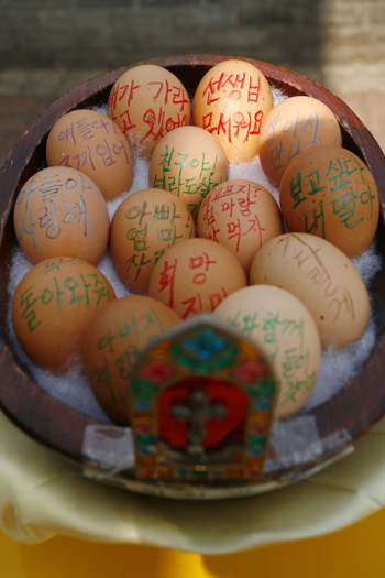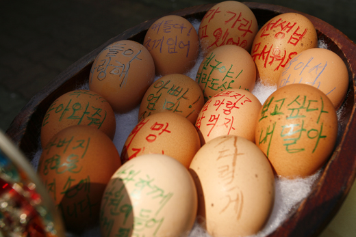 | ▲세월호 침몰사건 실종자들의 생환을 염원하는 희망 메시지가 적힌 부활절 계란들. ⓒ사진=지유석 기자 |