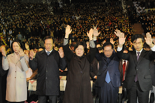 | ▲2014 한국교회 부활절연합예배에 참석한 정치인들이 순서에 따라 찬양을 부르고 있다. ⓒ사진=김진한 기자 |