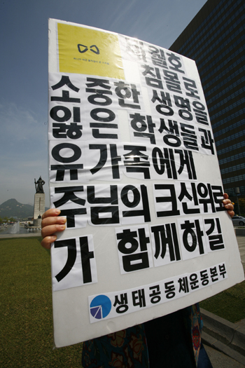 한국기독교장로회 생태운동본부는 21일(월) 서울 광화문 광장에서 세월호 침몰 사고 희생자들의 넋을 위로하는 1인 시위를 벌였다. 피켓에는 “세월호 침몰로 소중한 생명을 잃은 학생들과 유가족에게 주님의 크신 위로가 함께하길”이라고 적혀 있다.