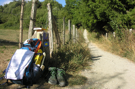 이제 길은 두 사람이 겨우 교차할 정도의 폭으로 좁아졌다. 가파른 오르막은 숨을 몰아쉬게 하였고, 신에는 뽀얀 먼지가 내려앉기 시작했다. 해발 950여 미터 메스키리스 산마루에서 내려다보이는 마을은 아마도 비스카레트Biskarret일 것이다. 아내의 배낭에 매달려 흔들거리던 젖은 수건이 바싹 마를 만큼 햇볕은 금세 강렬해졌다. 간간이 보이던 구름은 ‘온다간다’ 말도 없이 사라졌다. 그늘은 서늘하고 양지는 따갑다. 양지에 있으면 그늘이 그립고, 그늘에 있으면 양지가 간절해진다.