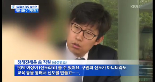 | ▲KBS는 청해진해운 전 직원과의 인터뷰에서 청해진해운 직원의 90% 이상이 구원파 신도라는 증언을 확보했다. ⓒKBS 방송화면 캡쳐 |