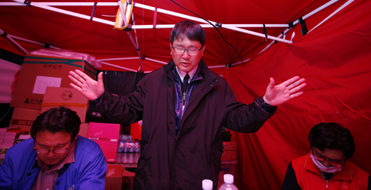 | ▲진도군교회협의회(진교련)은 사건 발생 직후부터 팽목항에 캠프를 차리고 실종자 가족들과 취재진 등에게 생필품 및 음료수 등을 제공해 왔다. 그러나 진교련 소속 목회자들은 실종자 가족들과 접촉이 여의치 않아 아쉬워 하고 있다. ⓒ사진=지유석 기자 |