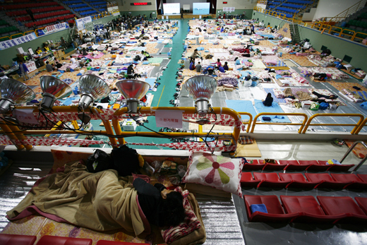 | ▲실종자 가족들이 대기 중인 진도 체육관. 새우잠을 청하는 가족도 눈에 띤다. 실종자 가족들은 대형 스크린을 통해 뉴스를 전해들으며 촉각을 곤두세우고 있다. ⓒ사진=지유석 기자 |