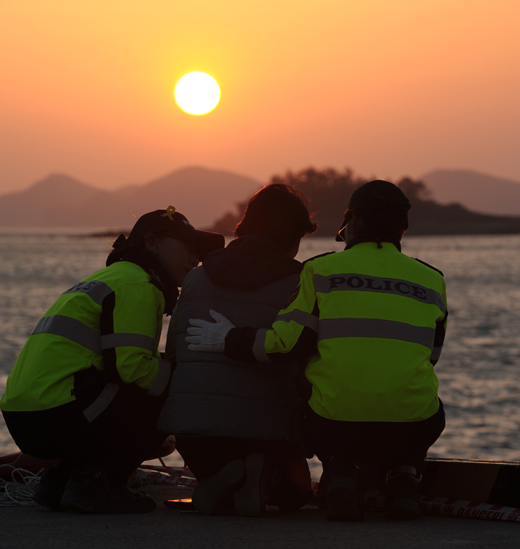 | ▲팽목항에서 바라보는 저녁놀은 더없이 아름답다. 한 실종자 가족이 아이의 귀환을 기도하며 무릎을 꿇고 기도를 드리고 있다. 이 분은 여자 경찰관의 도움을 받아 일어선 뒤 진도 앞바다를 응시하며 아이의 귀환을 다시 한 번 간절히 소원했다. ⓒ사진=지유석 기자 |