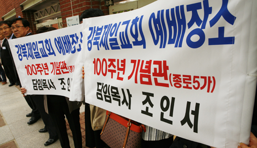 | ▲지난 4일 주일예배시 강북제일교회 조인서 목사측 성도들이 강북제일교회 건물 앞에서 예배 장소 변경을 알리는 현수막을 든채 서 있다. ⓒ사진=지유석 기자 |