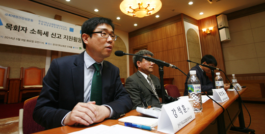 종교인 납세 문제가 사회적 이슈로 떠오른 가운데 5개 기독교 시민단체(교회개혁실천연대, 기독경영연구원, 기독교윤리실천운동, 바른교회아카데미, 재단법인 한빛누리) 연합체인 교회재정건강성운동과 한국기독교교회협의회(NCCK)는 8일(목) 서울 종로구 연지동 기독교회관에서 기자회견을 열어 ‘목회자 소득세 신고 지원활동’의 취지 및 세부 지원방안에 대해 설명했다.