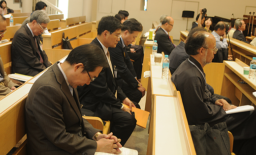 | ▲한·중·일 신학자들이 세월호 참사 희생자들을 위해 침묵의 기도를 드리고 있다. ⓒ사진=김진한 기자 |