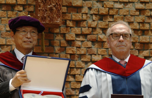 | ▲장신대 김명용 총장(좌)이 스승인 위르겐 몰트만 박사에게 명예신학 박사학위를 수여하고 있다. ⓒ공동취재단 |