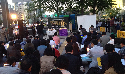 ▲15일 오후 서울 세종로 파이넨스 빌딩 앞에서 촛불교회 주관으로 세월호 참사관련 촛불기도회가 열렸다. ⓒ공동취재단