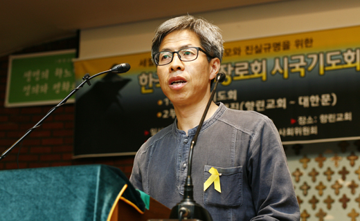 비판의 목소리는 인사말에서도 이어졌다. 총회 총무를 맡고 있는 배태진 목사는 인사말을 통해 “실종자 가족 눈높이에 맞춘 참사 해결망안은 실종자 수색과 진실규명이다”라며 “박 대통령이 취한 해경해체 조치는 전혀 앞뒤가 안맞는 것”이라고 일갈했다. 배 목사는 “가장 시급한 개조대상, 그리고 청산해야 할 적폐는 바로 박 대통령 자신”이라고 꼬집었다. 이 자리엔 ‘민주사회를위한변호사모임(민변)’ 세월호 특위 위원장 권영국 변호사도 참석했다.