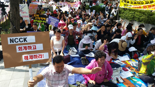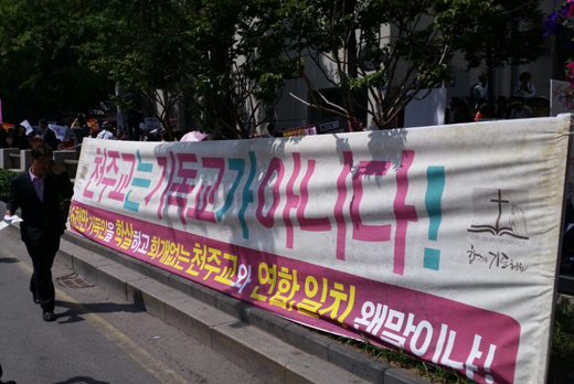 | ▲22일 덕수궁 앞에서 개신교와 천주교 간 한국 그리스도교 신앙과 직제 협의회 창립에 반발하는 보수교회 교인들이 반대집회를 열고 있다. ⓒ사진=공동취재단 |