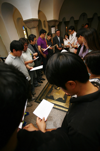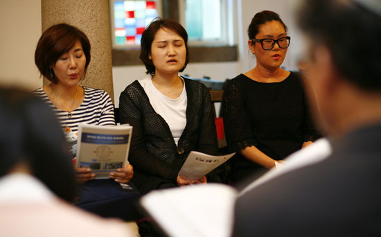 | ▲27일(화) 오후 대한성공회 주교좌 성당에서 이스라엘과 팔레스타인의 평화를 위해 기독교인들이 두손 모아 기도하고 있다. ⓒ사진=지유석 기자 |