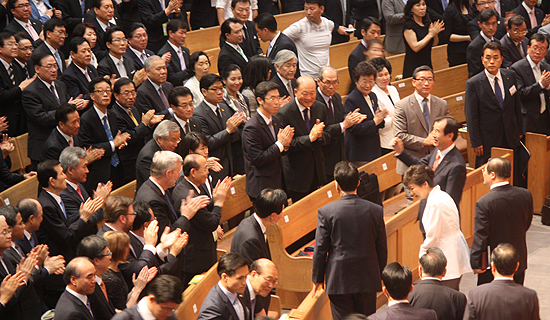 교계 지도자들 특히, 주요 단체장들과 증경총회장들이 주축이 되어 ‘세월호 참사 위로와 회복을 위한 한국교회 연합기도회’가 1일 저녁 7시 명일동 명성교회(담임 김삼환 목사) 본당에서 열렸다. 이날 본당은 기대 이상의 참석자들로 인해 자리가 부족하여 본당에 들어가지 못한 약 2천 여명에 이르는 참석자들은 본당 밖에 따로 자리를 마련해 동참했다.