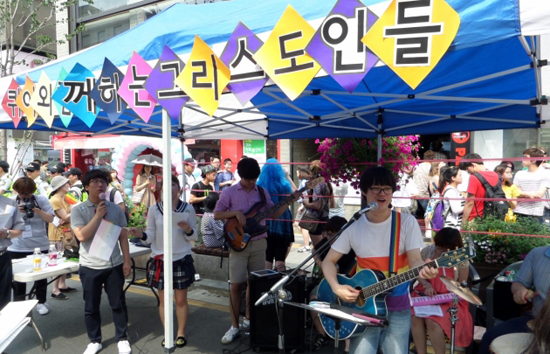 | ▲‘퀴어 퍼레이드’와 성소수자를 지지하는 크리스천 연대인 ‘퀴어와 함께하는 그리스도인들’이 찬양을 부르며 거리 공연을 하고 있다. ⓒ공동취재단 |