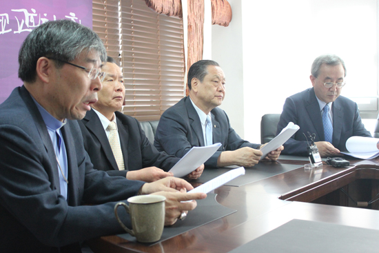 | ▲연세대 대책위는 25일(수) 오전 기자회견을 열고 연세대 이사회 결의 무효확인 소송 상고를 결정했다. 왼쪽부터 대한성공회 김근상 대주교, 기장 박동일 총회장, 예장통합 김동엽 총회장, 손달익 대책위원회 위원장. ⓒ사진제공=NCCK |