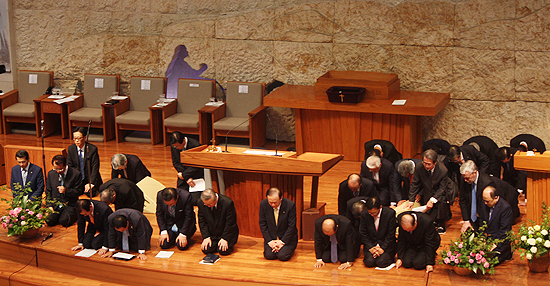 | ▲교계 원로들이 지난달 1일 명성교회에서 ‘세월호 참사 위로와 회복을 위한 한국교회 연합기도회’를 갖는 장면. 이날 기도회에는 세월호 참사 유가족 대표가 아닌, 박근혜 대통령이 초청돼 인사말을 전했다. 이에 세월호 유족들의 눈물이 아닌, 권력자의 눈물을 닦아주는 소위 ‘권력자를 옹호하는 교게 원로들의 행사’란 비난을 받은 바 있다.ⓒ베리타스 DB |