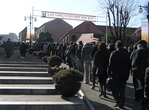 명동성당에 안치된 고 김수환 스테파노 추기경(87)을 추모하기 위한 조문행렬이 명동성당 앞으로 길게 이어지고 있다. 17일 오전 김대중 전 대통령을 비롯해 정·재계 인사들 그리고 종교계 대표들도 고 김수환 추기경을 조문으로 명동성당 대성당을 찾았다.