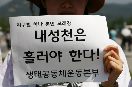| ▲기장 생태공동체운동본부가 7일 오전 서울 광화문 광장에서 "내성천은 흘러야 한다!"며 피켓 시위를 벌인 후 기자회견을 가졌다. ⓒ사진=지유석 기자 |