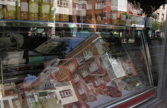 이미 팜플로나에 들어온 것이지만, 우리가 묵을 ‘헤수스 이 마리아 알베르게’까지 4킬로미터 이상을 더 가야 한다. 상점들이 즐비하다. 아주 고급스런 모양을 낸 쿠키와 케익, 방금 구워낸 것처럼 보이는 통통한 살 오른 빵이 진열대에서 뽐내고 있다. 각종 향신료를 담아 놓은 병, 연두색 완두콩을 가공한 통조림, 바로 요리하면 될 정도로 깨끗하게 다듬어진 생닭과 부위별로 큼지막하게 썰어져 있는 살이 붉은 고깃덩어리, 그 위에 덜렁 올라가 있는 돼지머리가 낯설지 않은 푸줏간도 보인다.