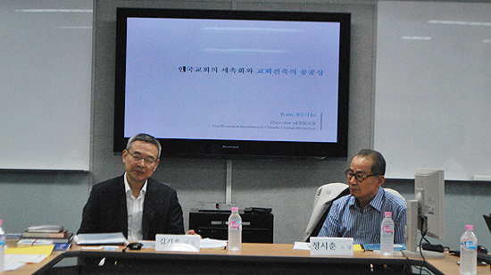 | ▲김기호 서울대 명예교수(좌)가 ‘한국교회의 세속화와 교회건축의 공공성’을 주제로 발제하고 있다. ⓒ사진=이인기 기자 |
