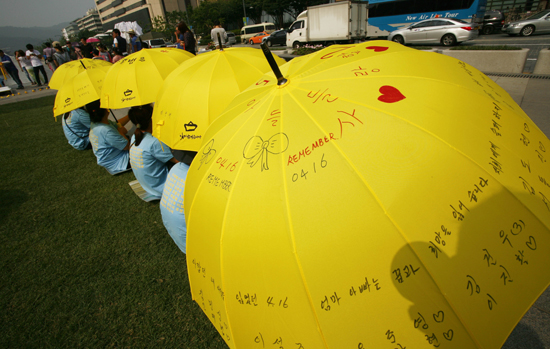| ▲14일 세월호 참사 희생자 유가족들이 희생된 아이들의 이름을 적은 노란 우산을 펼치고 시민들에게 특별법 마련을 호소하고 나섰다. ⓒ사진=지유석 기자 |