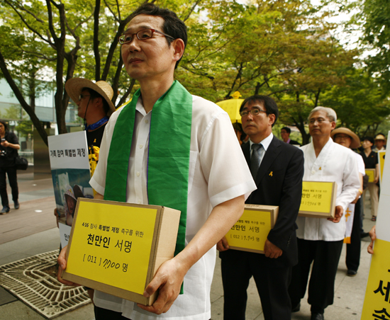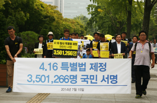 세월호 참사 특별법 발의 요구가 비등하는 가운데 세월호 참사 유가족들은 15일(화) 오전 서울 여의도 공원에서 시민 사회단체와 함께 <4.16 특별법 제정 국민서명 전달식> 기자회견을 열었다. 유가족들과 시민들은 ‘세월호 특별법’의 조속한 제정을 촉구하는 총 3,501,266명의 서명이 담긴 서명용지를 국회에 전달했다.