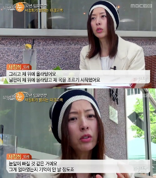 지난 5월 부인폭행으로 물의를 일으킨 개그민 출신 서세원의 폭행사건 전말이 보도돼 충격을 자아내고 있다. 24일 오후 방송된 MBC '리얼스토리 눈'에서는 연예계 대표적 잉꼬부부 서세원-서정희가 파경에 이른 결정적 폭행장면이 기록된 CCTV 영상이 공개됐다.