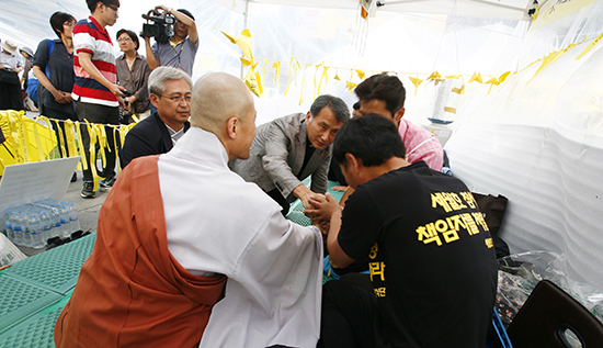 김대선 원불교 평양교구장, 정토회 유수 스님, 천주교 김홍진 쑥고개 성당 주임신부 등 종교인모임 주요 인사들은 광화문 광장에서 특별법 입법을 촉구하며 단식 중인 유가족을 만나 격려 메시지를 전했다.