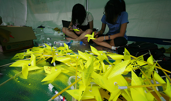| ▲광화문 광장에 마련된 단식 농성장에서 학생들이 노랑색 바람개비에 세월호 참사 희생자를 추모하는 메시지를 적고 있다. ⓒ사진=지유석 기자 |