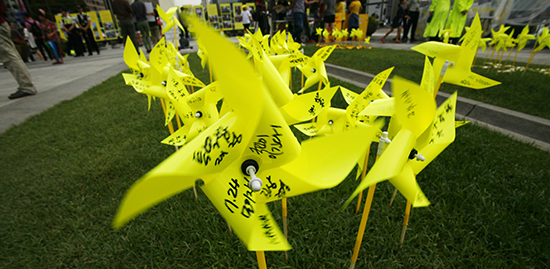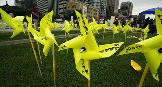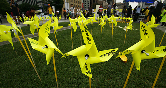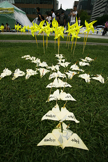 24일(목) 세월호 참사 100일째를 맞은 가운데 희생자 유가족들이 단식농성 중인 서울 광화문 광장엔 희생자 추모 및 세월호 특별법 제정을 요구하는 메시지를 담은 바람개비가 가득하다. 이날 서울 시청광장엔 추모 음악회가 열린 한편, 명동 향린교회에서는 추모 예배가 열리는 등 세월호 참사 희생자를 추모하고 유가족들을 위로하는 자리가 다양하게 마련됐다.