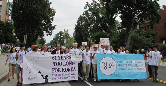 지난 26일(현지시각) 워싱턴에서 <한반도 화해와 통일을 위한 평화의 행진>(이하 평화행진) 행사가 열렸다. 300여명의 참가자는 이날 한반도 지도가 그려진 티셔츠를 입은채 백악관 앞까지 1.2km를 행진했다.