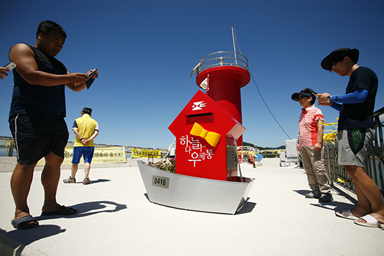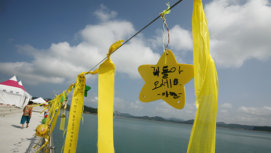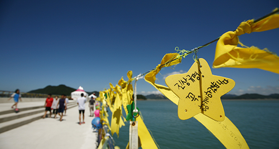 31일(목)로 세월호 참사 발생 107일째를 맞는 가운데 사고 현장인 진도 팽목항은 적막감이 감돈다. 세월호 참사 희생자를 추모하는 메시지와 실종자들의 귀환을 염원하는 노란 리본만 가득하다.