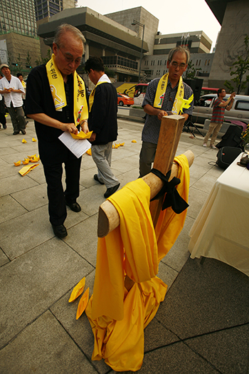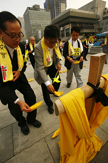 8월 7일(목) 오후 서울 광화문 광장에서 ‘세월호 진상규명 특별법 제정 촉구를 위한 예장 목회자 기도회’가 열린 가운데, 기도회를 마친 목회자들이 노란 종이배에 세월호 희생자 추모 메시지를 적어 십자가 앞에 놓고 있다.