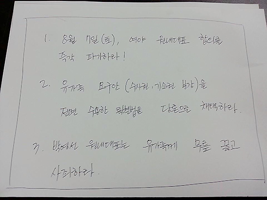 | ▲8일 밤 박영선 의원실을 점거, 농성 중인 한신대 신학생 김모씨가 공개한 이들 신학생들의 요구 사항. |