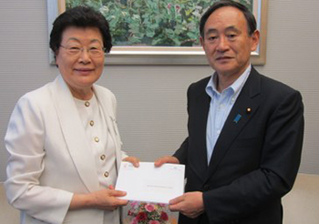 | ▲WCC 아시아지역 의장인 장상 박사가 스가 요시히데 일본관방장관에게 WCC 성명서를 전달하고 있다. ⓒ사진제공=WCC |